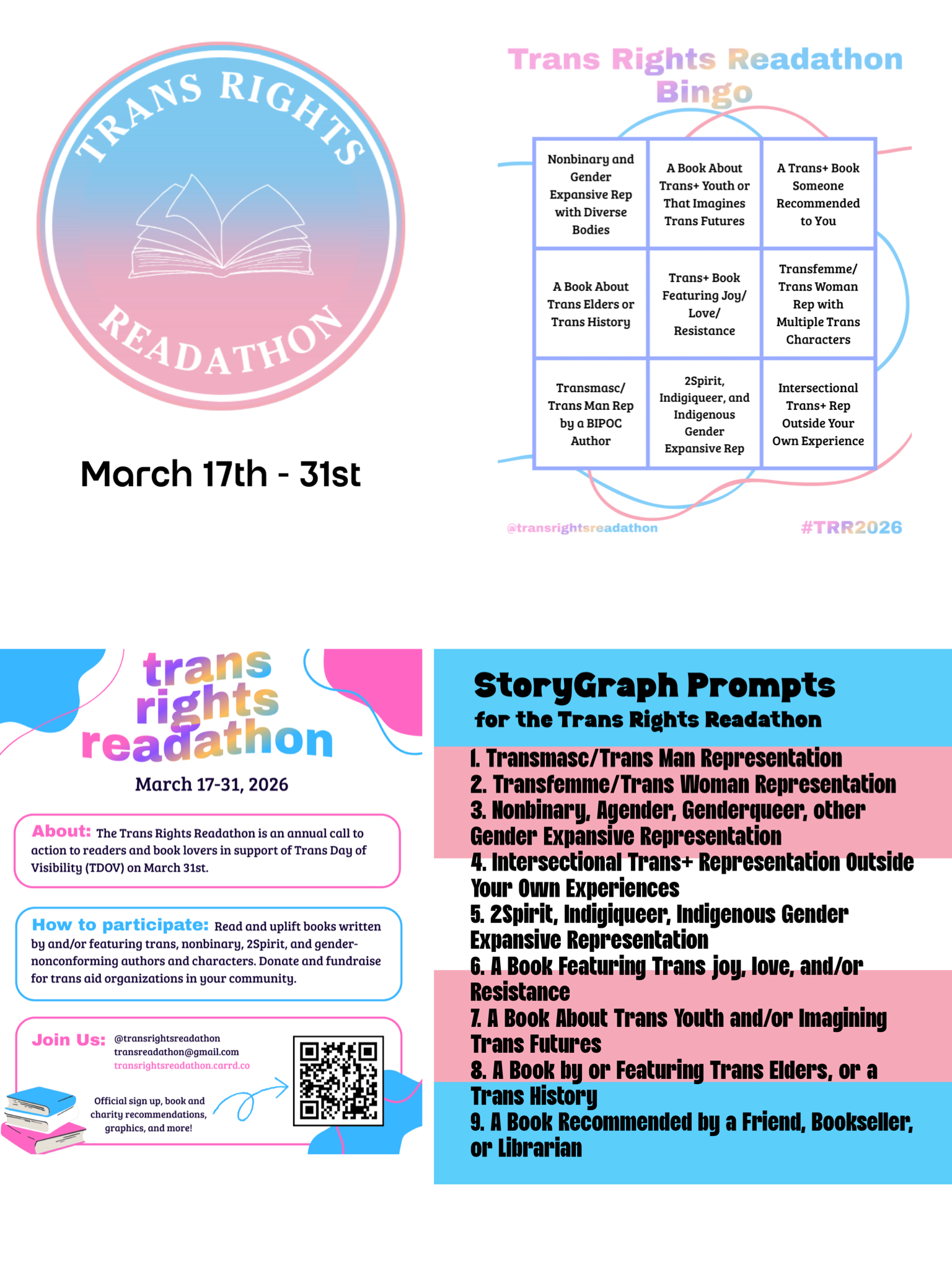 Trans Rights graphics to learn about the Readathon, Story Graph prompts